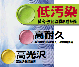これにより水性塗料の常識を超えた低汚染性を発揮するとともに、溶剤形アクリルシリコン樹脂塗料に匹敵する高い耐久性と高光沢仕上げを実現しました。